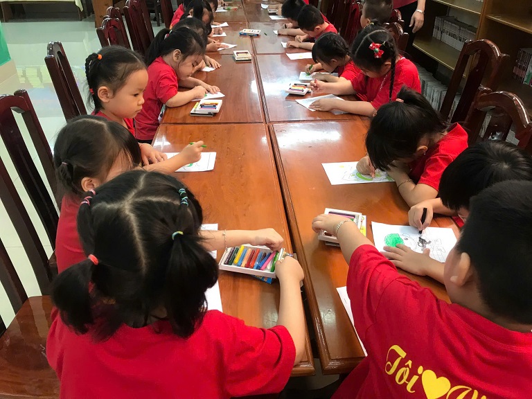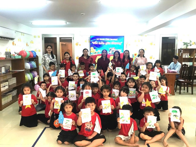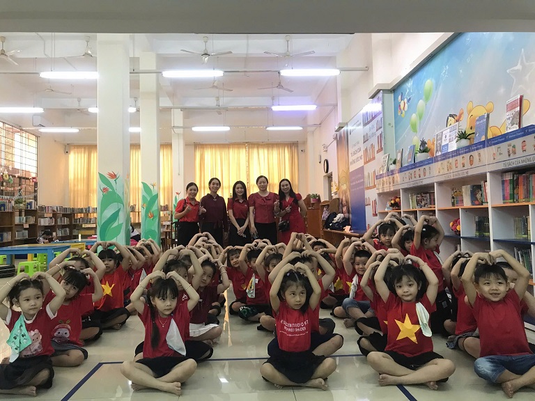 Đối với khối mầm non, ứng dụng phương pháp kể chuyện bằng âm nhạc với hình thức học thơ qua đôi bàn tay, bài thơ “Đến thăm chú bộ đội” mang đến không gian âm nhạc nhiều trải nghiệm và thú vị. Tiếp nối với hoạt động tô tranh tập thể “Sắc màu yêu thương” trong không gian âm nhạc, ứng dụng phương pháp giáo dục cảm thụ bằng âm nhạc, được các bạn nhỏ nhiệt thành tham gia và hưởng ứng hoạt động. Tiếp tục là hoạt động ứng dụng STEAM vào phục vụ khối mầm non với trò chơi “Pháo khí”, vừa gắn kết với chủ đề vừa tạo sự phấn khích cho trẻ khi khám phá về khoa học tự nhiên. Trò chơi rèn luyện phản xạ với bóng “Em là chiến sĩ nhỏ”“Bé làm khăn tay gửi tặng chú bộ đội” nhằm phát triển các vận động tinh và thô, hình thành kỹ năng làm việc nhóm và vận động khéo léo.