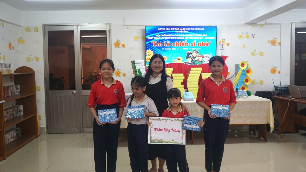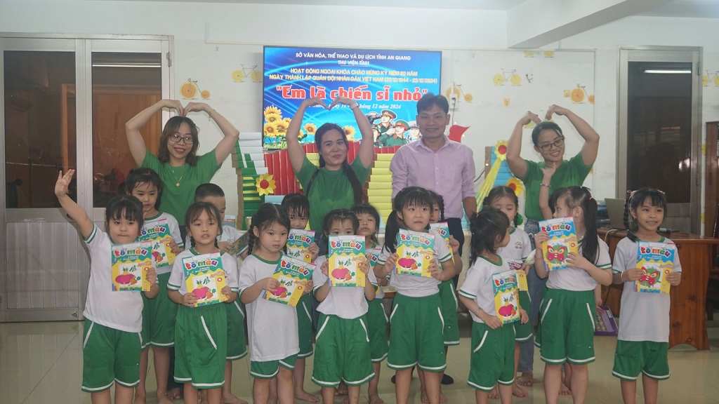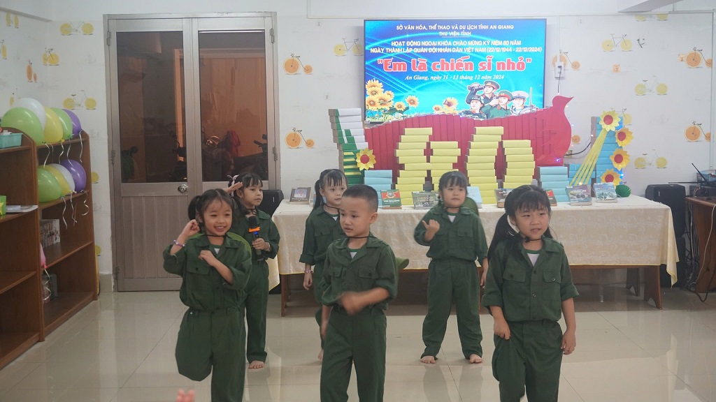 Nhân dịp kỷ niệm 80 năm ngày thành lập Quân đội Nhân dân Việt Nam (22/12/1944 – 22/12/2024), Thư viện tỉnh đã tổ chức chuỗi hoạt động ngoại khóa với chủ đề “Em là chiến sĩ nhỏ”. Chương trình diễn ra vào các ngày 11/12, 12/12 và ngày 13/12/2024, thu hút sự tham gia của gần 200 học sinh từ Trường Tiểu học Trần Quang Khải, Trường Mẫu giáo Hoàng Oanh và Trường Mẫu giáo Cầu Vồng (TP. Long Xuyên).