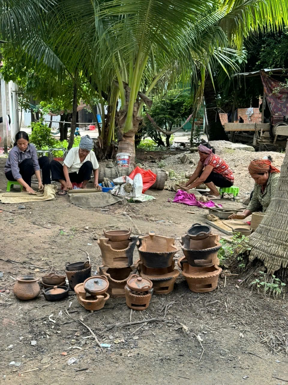Làng gốm Phnôm Pi có khoảng trăm năm nay. Điểm khác biệt ở làng gốm này là tất cả sản phẩm đều được làm thủ công,sử dụng các công cụ đơn giản, tạo hình độc đáo theo tập tục sinh hoạt của người Khmer, có những họa tiết được khéo léo tạo nên từ đôi tay người thợ và độ bền của các sản phẩm gốm rất cao. Theo sự phân công trong nghề, đàn ông thì đào đất, gánh đất, đốn củi, nung gốm... còn phụ nữ đảm nhận khâu làm gốm. Bà con dân tộc Khmer cho biết đất dùng làm gốm được lấy ở độ sâu 1 - 2 m tại khu vực chân núi Nam Quy vì nó đặc biệt, hoàn toàn không lẫn tạp chất. Đất sau khi lấy về được ủ rồi tưới nước cho mềm; lấy cây đập; nhồi đất; nặn thành hình; nặn họa tiết; đem phơi từ 5 - 7 ngày; cuối cùng đem nung bằng rơm, rơm phải được phủ kín để hơi không lọt ra ngoài mới nung ra mẻ gốm đẹp, thời gian nung khoảng 2 đến 3 giờ là gốm chín.