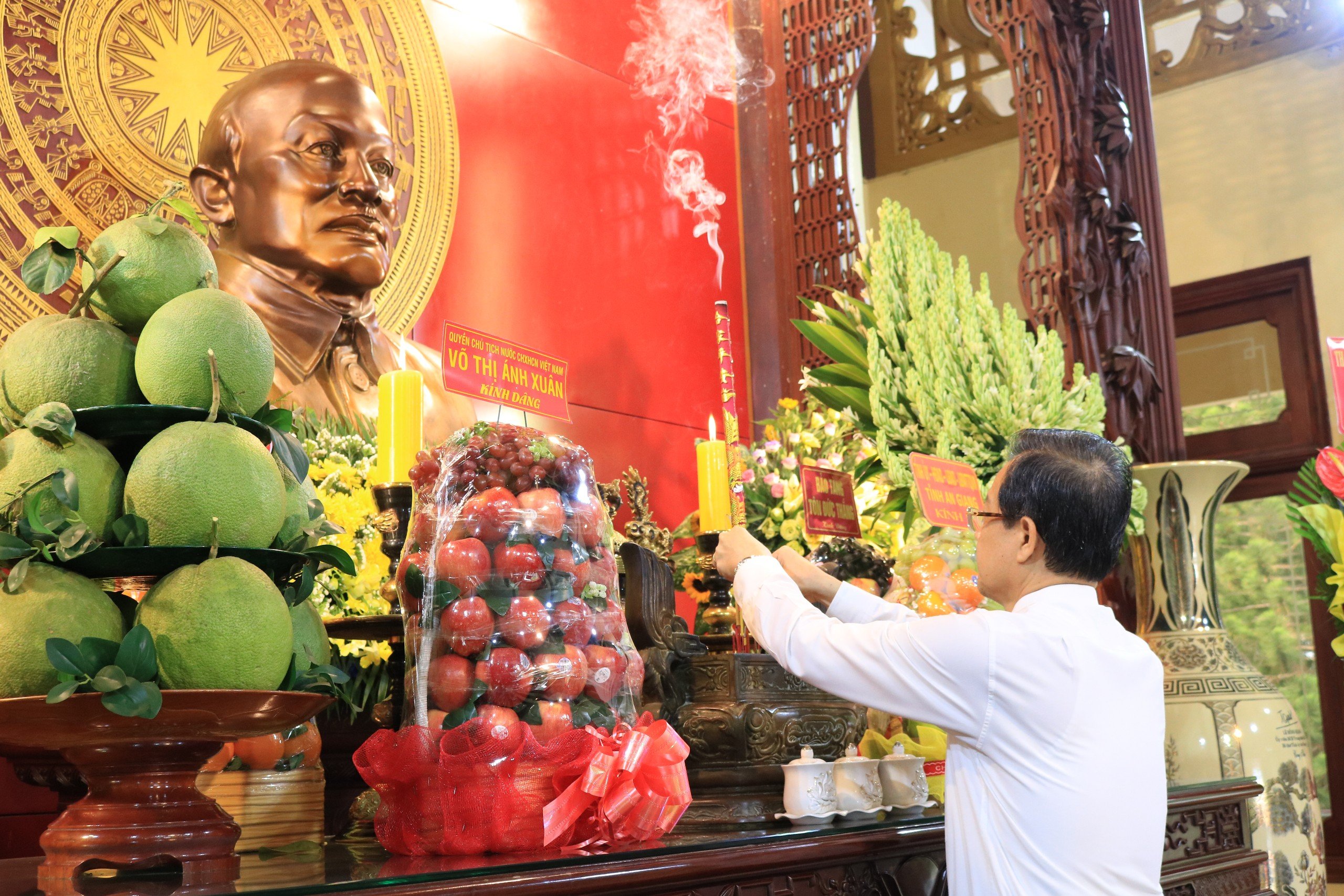 Đồng chí Võ Thị Ánh Xuân – Quyền Chủ tịch nước Cộng Hòa Xã hội Chủ Nghĩa Việt Nam đã gửi lẳng hoa tươi thắm, thành kính dâng lên Bác Tôn trong Lễ Tưởng niệm.