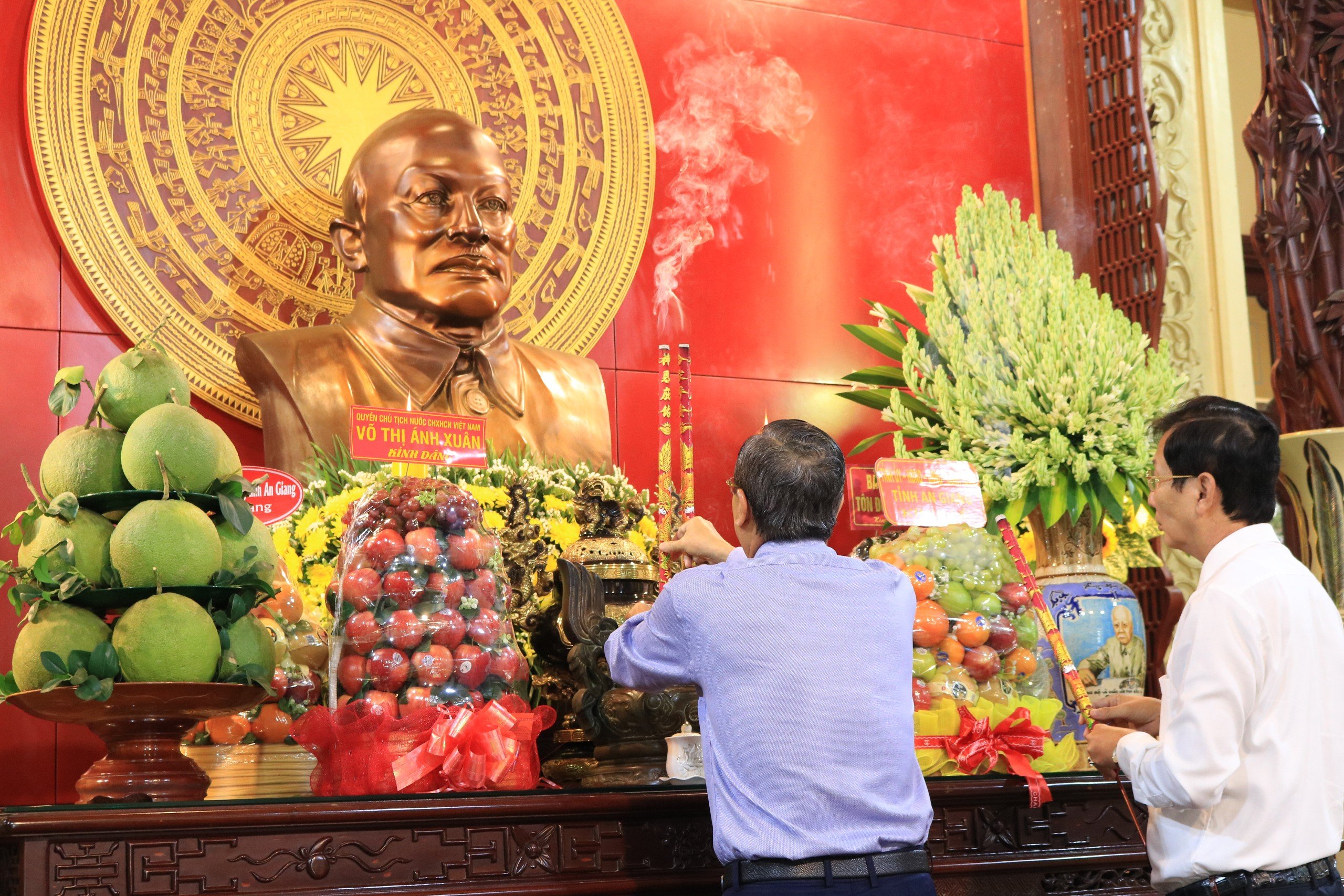 Trong không khí trang trọng của buổi lễ, tại Đền thờ Bác Tôn, đồng chí Lê Hồng Quang – Bí thư tỉnh ủy An Giang dẫn đoàn lãnh đạo Tỉnh ủy, Hội đồng nhân dân, Ủy ban nhân dân, Ủy ban mặt trận tổ quốc Việt Nam, các sở, ban ngành, đoàn thể cấp tỉnh đã thành kính làm lễ dâng hương, dâng hoa, dâng lễ vật tưởng niệm Chủ tịch Tôn Đức Thắng, thay mặt cho toàn thể đồng bào, chiến sĩ và nhân dân An Giang, bày tỏ lòng tri ân và biết ơn vô hạn đến với Bác, nguyện tiếp tục phấn đấu noi theo tấm gương, đạo đức ngời sáng của Bác, một lòng đoàn kết, quyết tâm thực hiện tốt mọi nhiệm vụ, đưa quê hương An Giang ngày càng phát triển phồn vinh, nhân dân An Giang có cuộc sống ấm no, hạnh phúc.